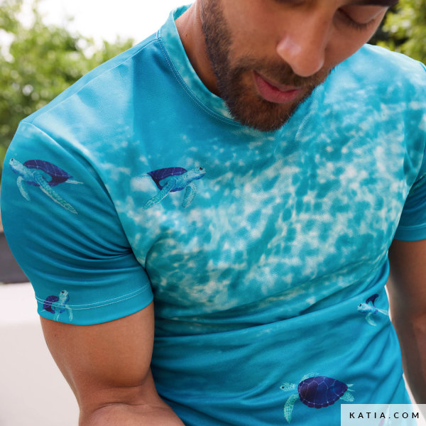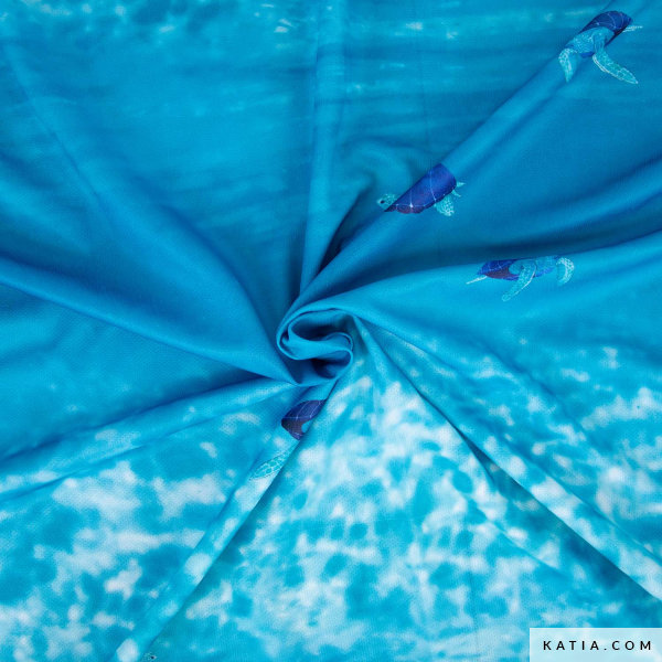 Technischer Sportstoff Cahuama Sport von Katia Fabrics mit einem beeindruckenden Druck von Meeresschildkröten, die in kristallklarem Wasser schwimmen. Dieser leichte und elastische Stoff wurde für atmungsaktive Sport-T-Shirts entworfen und eignet sich perfekt für alle, die Komfort und Stil in ihren Kleidungsstücken suchen. Mit schnelltrocknendem Material ist er ideal für Trainingskleidung, Outdoor-Aktivitäten oder personalisierte Sportmode. Erstelle dein eigenes Sport-T-Shirt mit diesem hochwertigen Stoff und bringe das Meer in deinen Kleiderschrank!